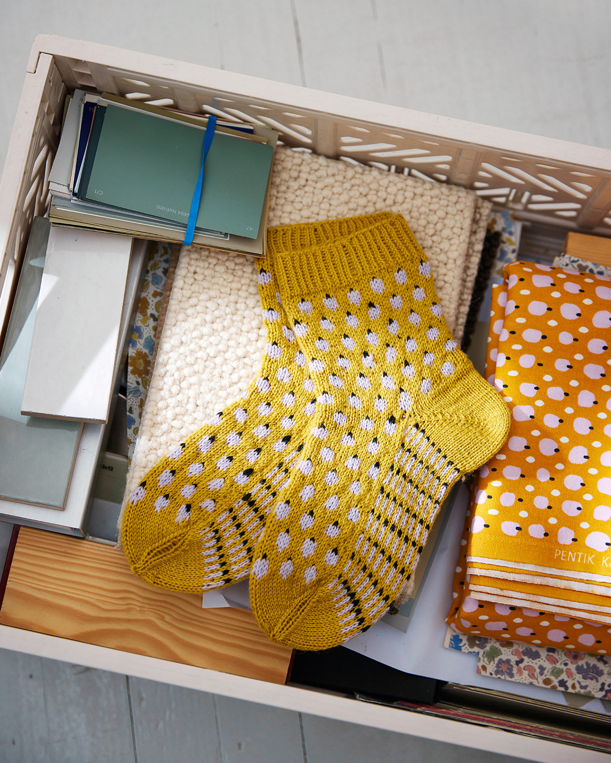 The pattern for the Kardemumma colorwork socks was previously published in Beloved Patterns & Pentik knitting magazine, where the inspiration came from Pentik's decorative textiles and ceramics.