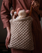 The bag in knitted with tripled yarn to maintain its shape in use. One side of the bag has a lacy texture and the other one is smooth.