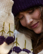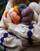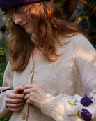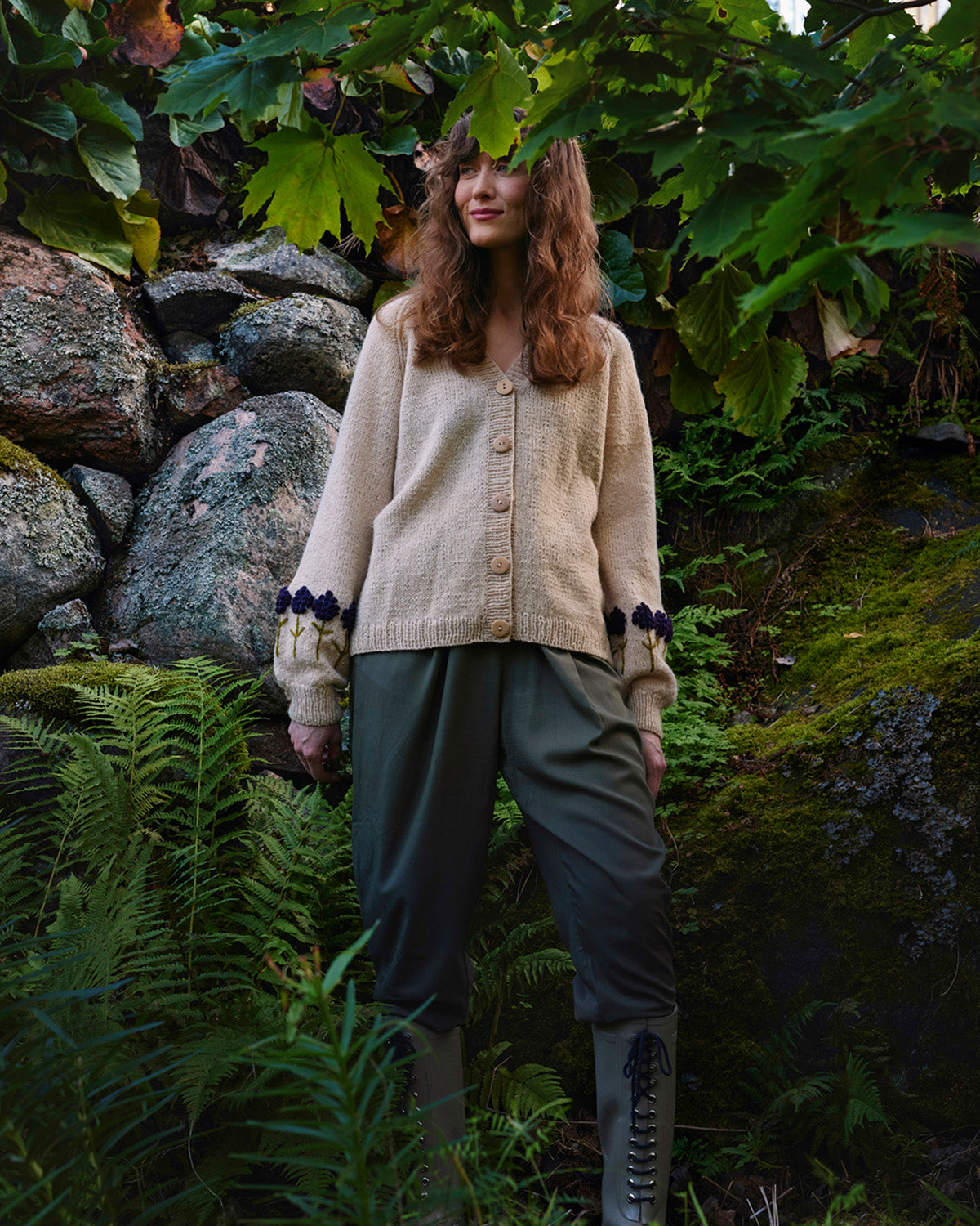 Liivia cardigan is worked seamlessly from the top down. The patterning on the sleeves is created by working knitted bobbles and crocheted stems.