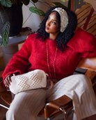 The crocheted Kupla Set contains a tube scarf, headband, and a bag which transforms into a toiletry bag if the strap is left out.