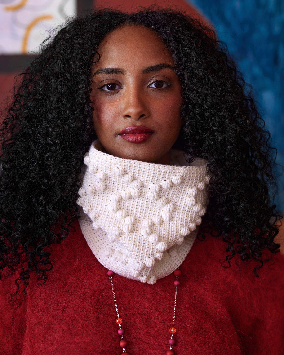 The crocheted Kupla Set contains a tube scarf, headband, and a bag which transforms into a toiletry bag if the strap is left out.