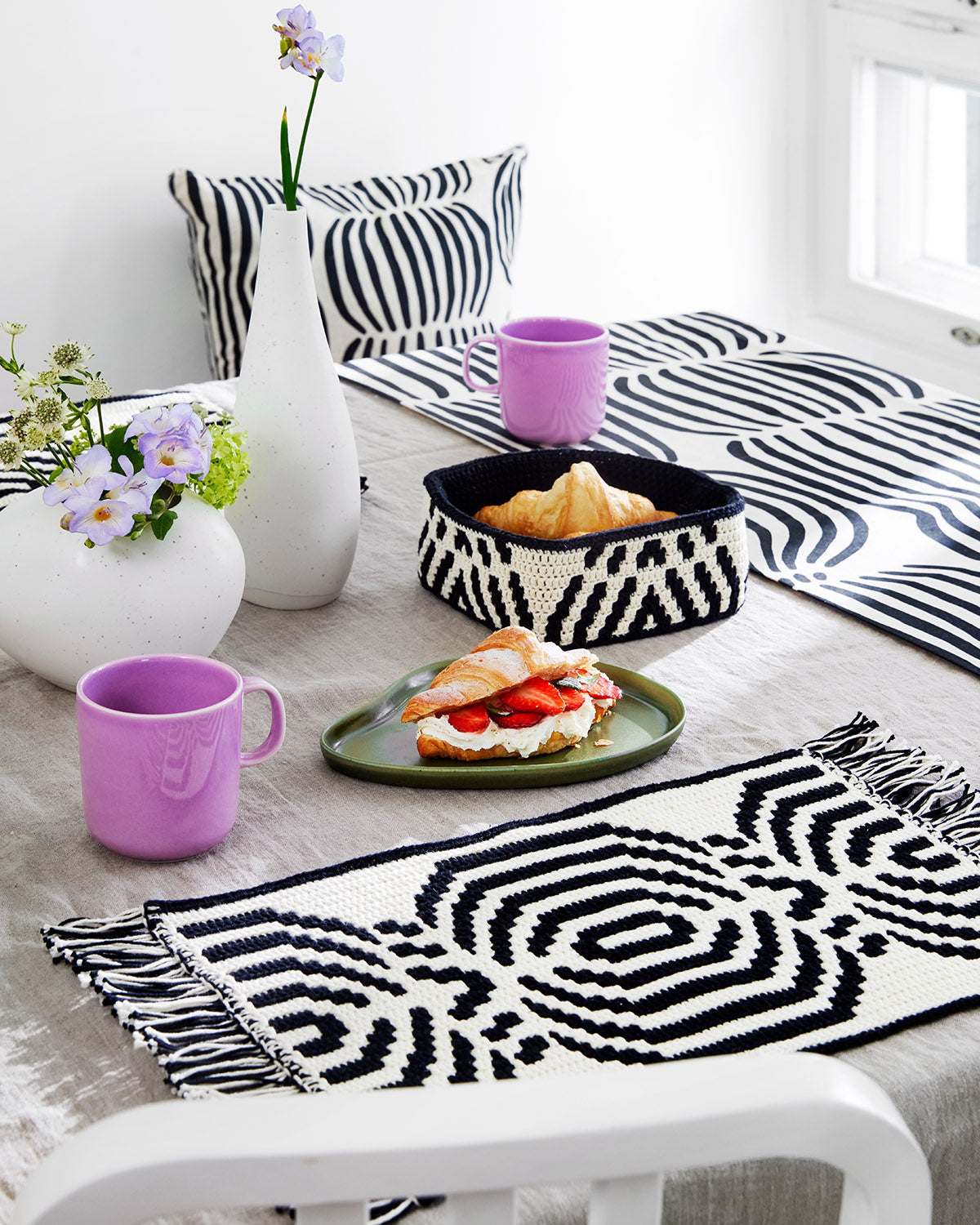The pattern for the Vilja placemat was previously published in Beloved Patterns & Pentik knitting magazine, where the inspiration came from Pentik's decorative textiles and ceramics.