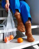 The textured pattern on the socks mimics the tree bark. The pattern is formed by working cables and twisted stitches. The socks are worked from the cuff down to the toes.