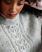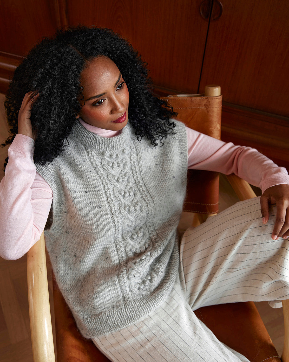 Keisarinna Vest is worked from the bottom up in the round. Its front is decorated by jewelry-like cables.