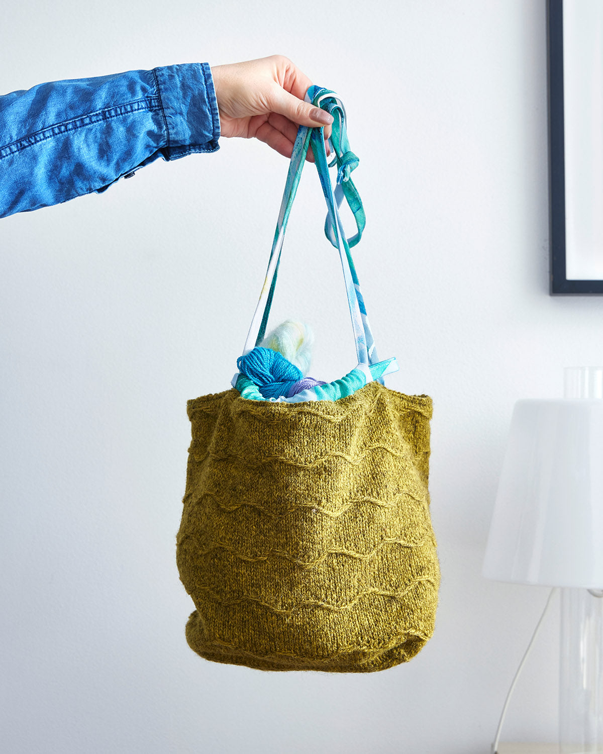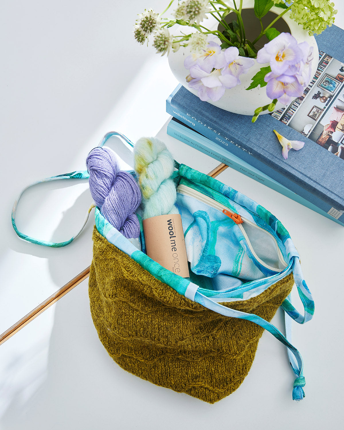 The lining of the Lumme project bag is done by sewing. The wavy texture of the outer bag is worked with slipped stitches.