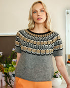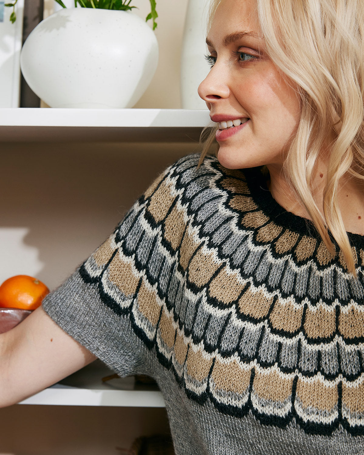 The sweater with a colorwork yoke is worked seamlessly from the top down. The back neck is raised using short rows for a perfect fit.