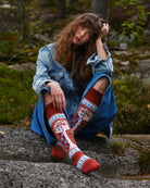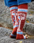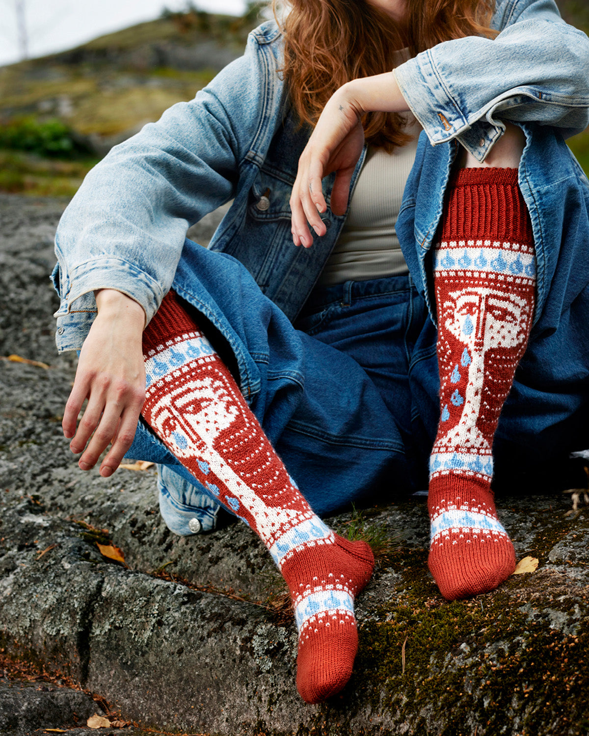 Powerfully emotional female figures cry on the socks. The picot edge and tight ribbing give structure for the socks.