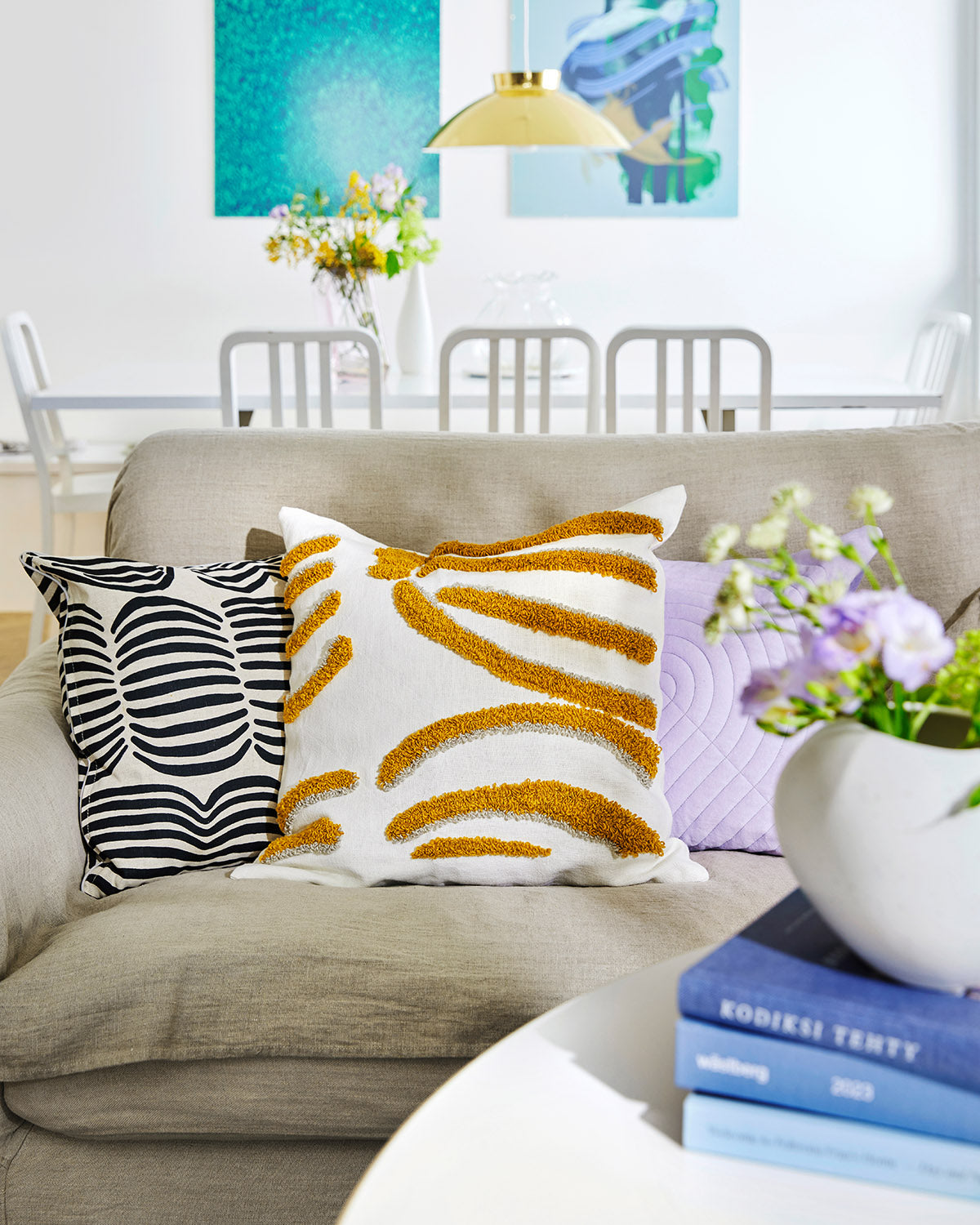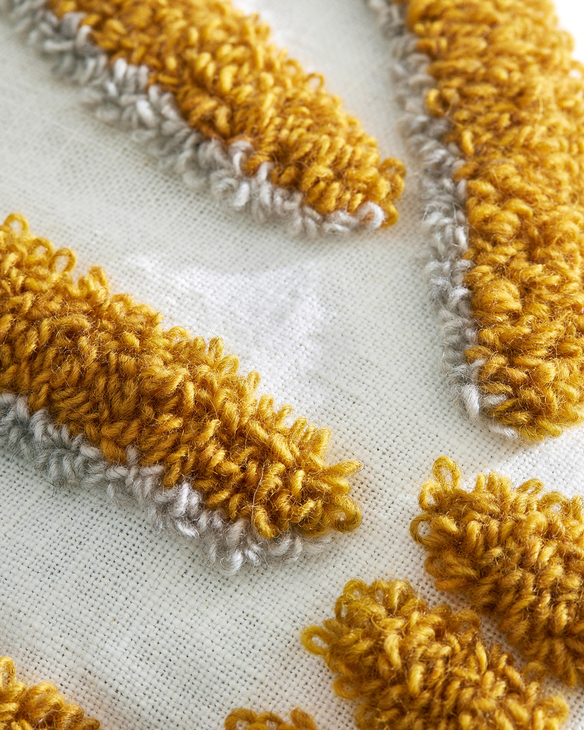 The motif of the cushion is tufted onto the fabric after which the pieces are sewn together to create a cushion. You can adjust the size of the motif.