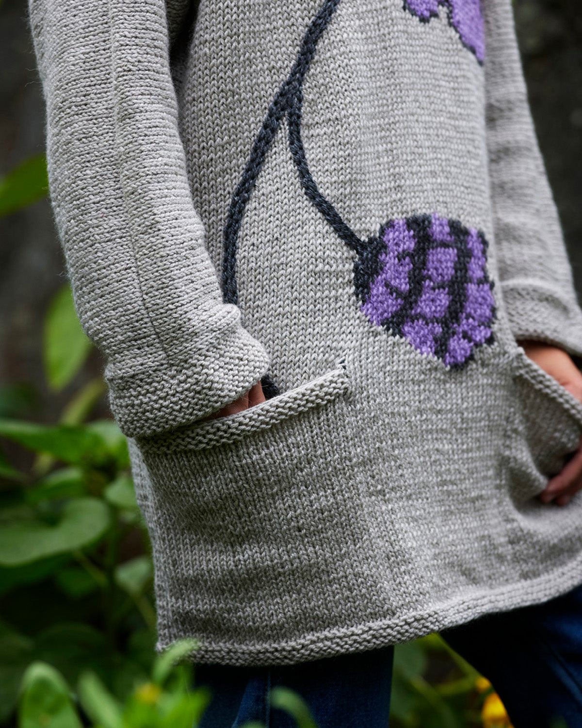 The sweater is worked in two separate pieces from the bottom up. The front pattern is worked using the intarsia technique.