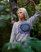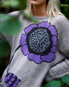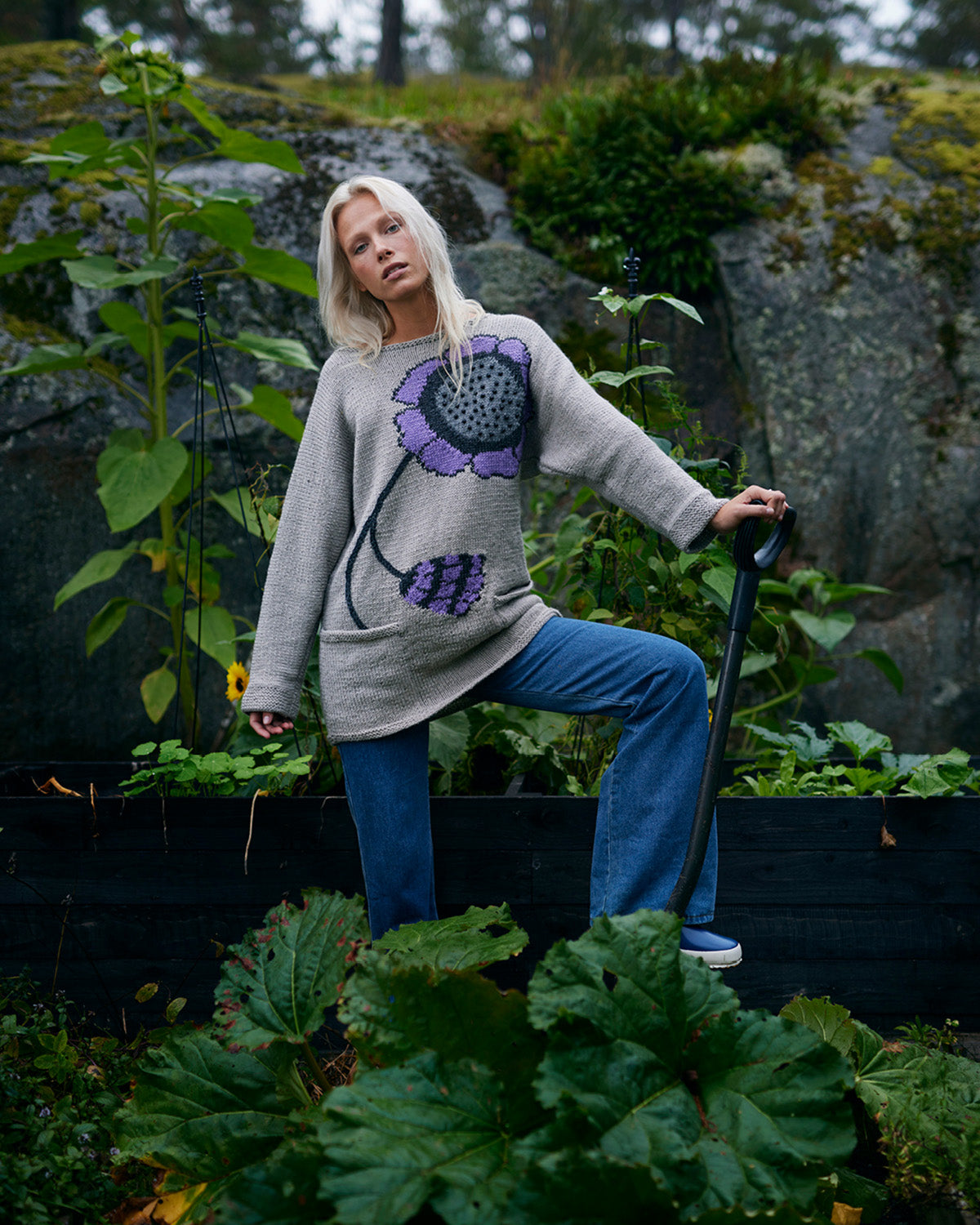Large floral patterns are added to the sweater by using the intarsia technique. The stem of the flower is embroidered afterwards.