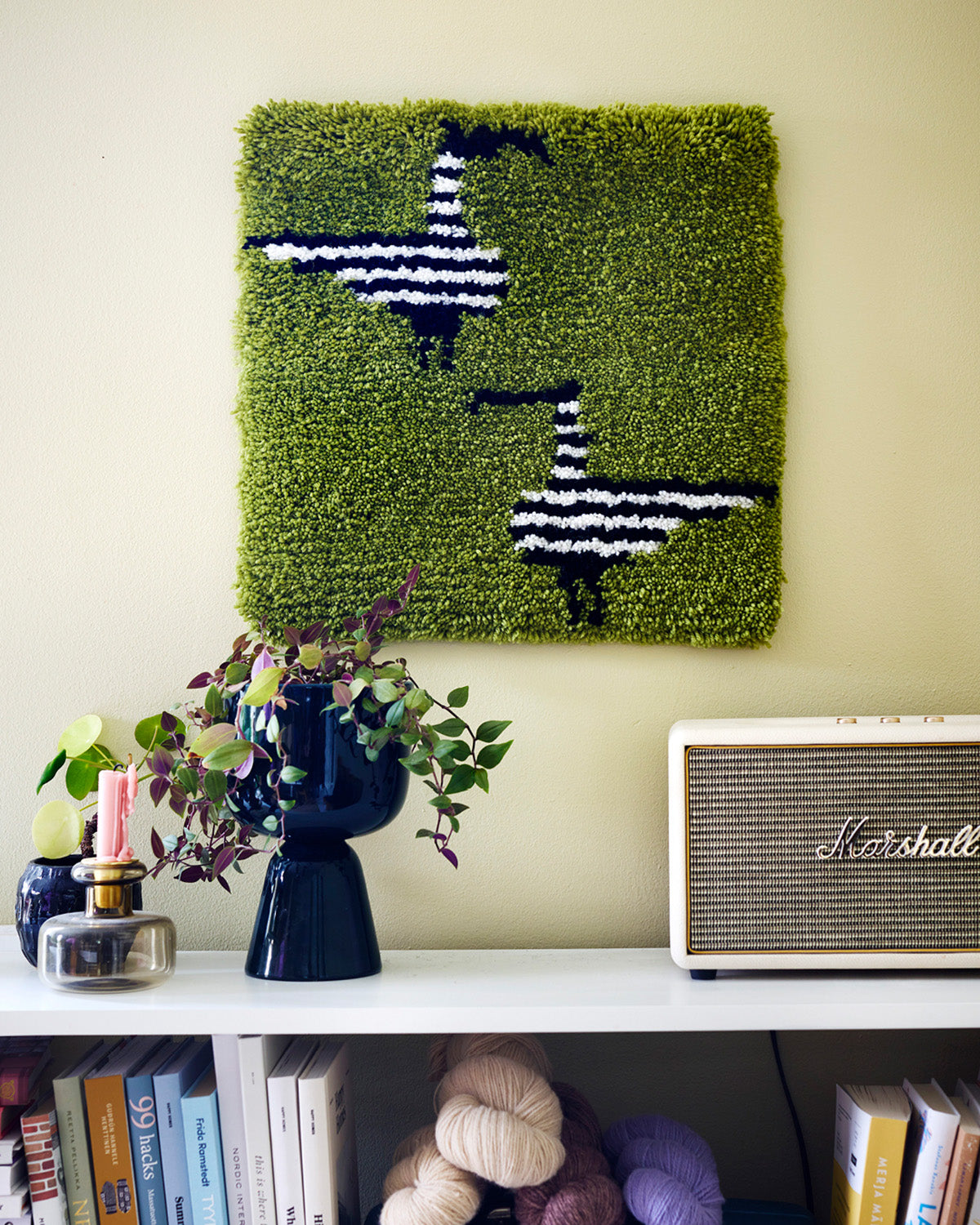 The Kaksi Kuovia pattern transforms into wall hanging rya or a cushion. The rya is worked onto a base fabric using traditional rya stitches.
