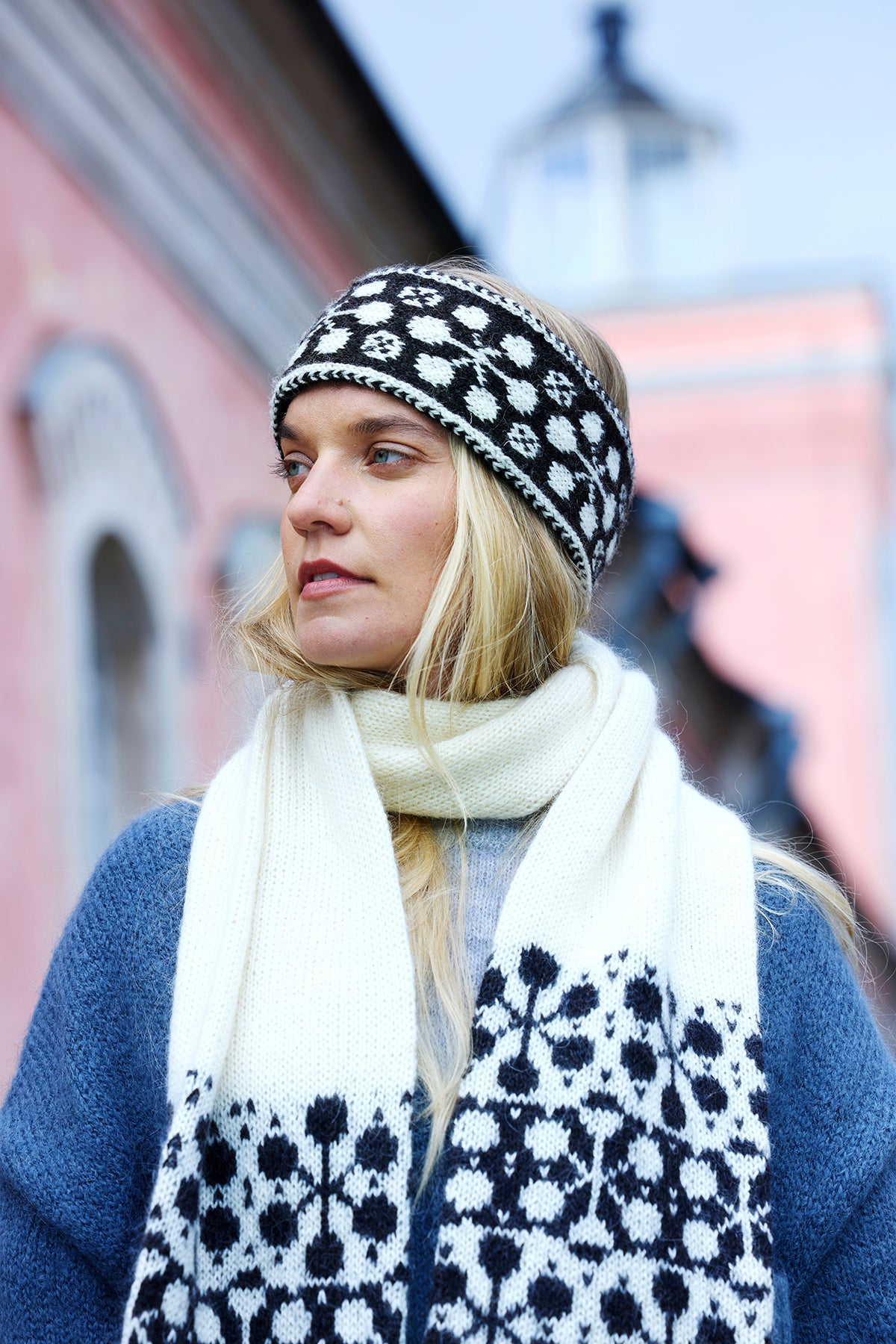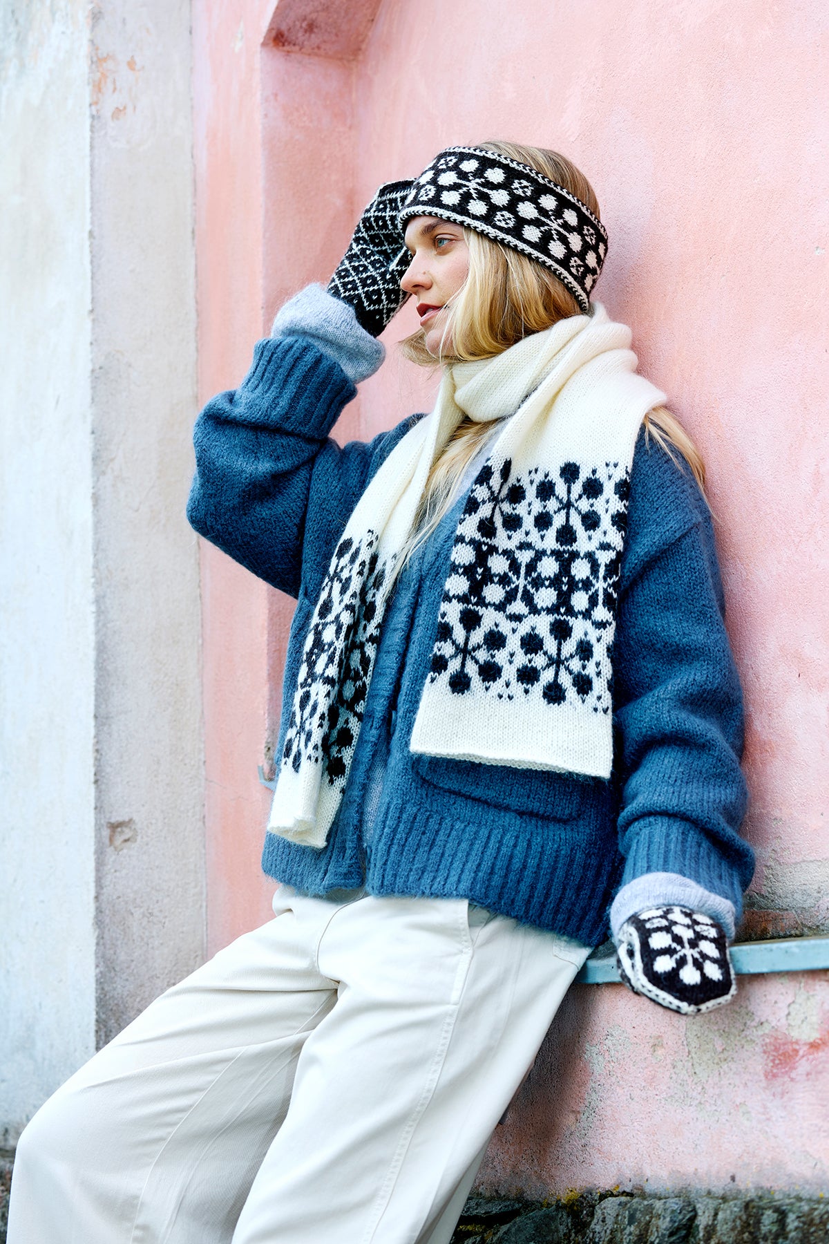 The wintery colorwork set is knitted in the round. The soft, fluffy texture comes from silk mohair yarn.