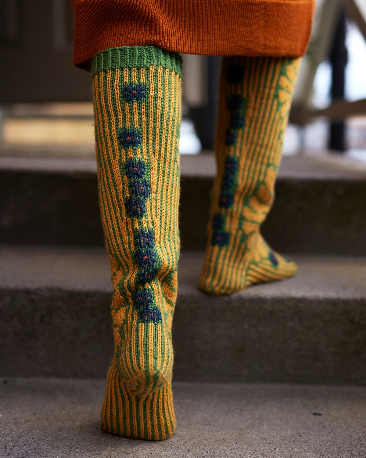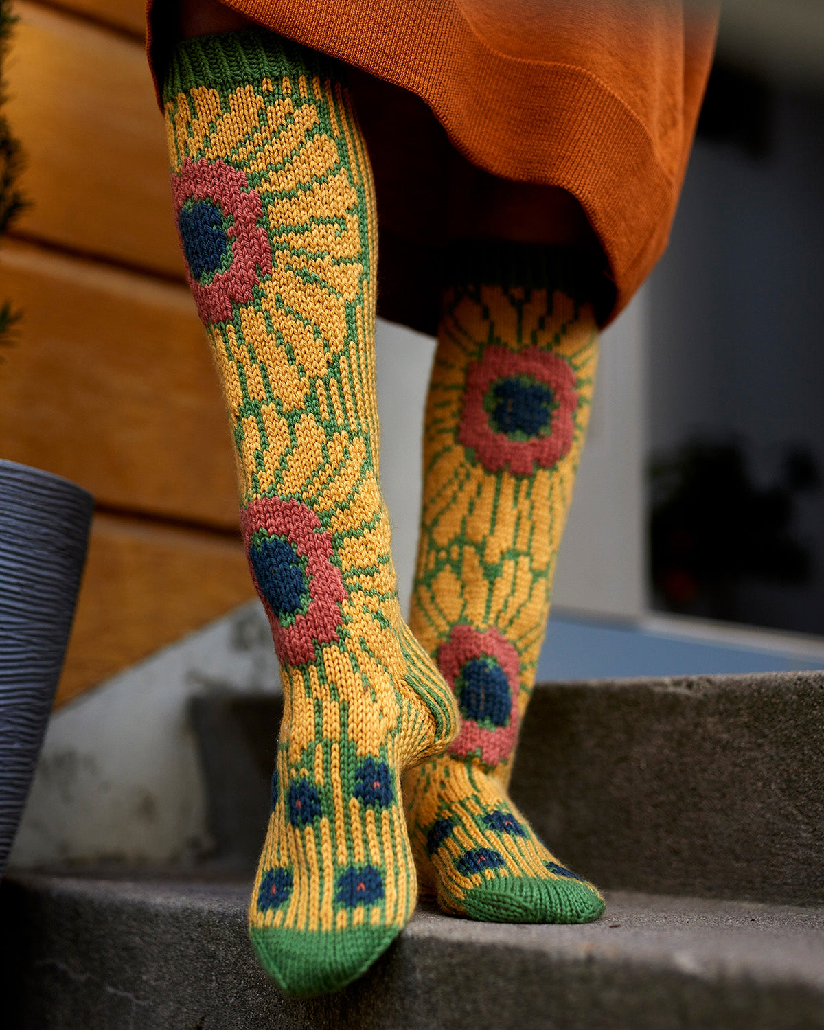 The pattern for the Auringonkukka socks was previously published in Beloved Patterns & Pihlgren and Ritola knitting magazine, where the inspiration came from Pihlgren and Ritola's iconic wallpaper patterns.