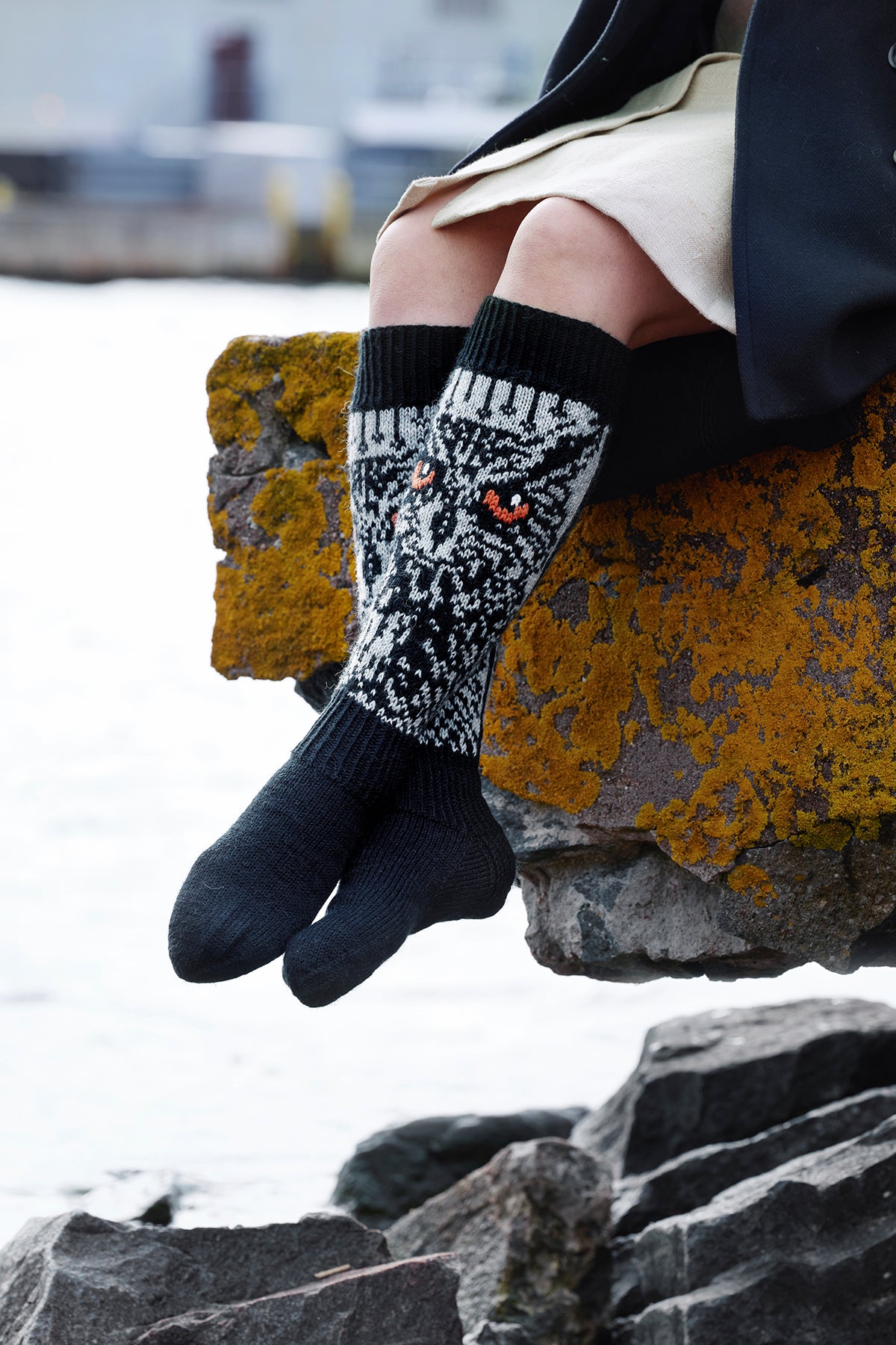 The striking socks are knitted from cuff to toe. The eagle owl’s eyes are embroidered on afterward.