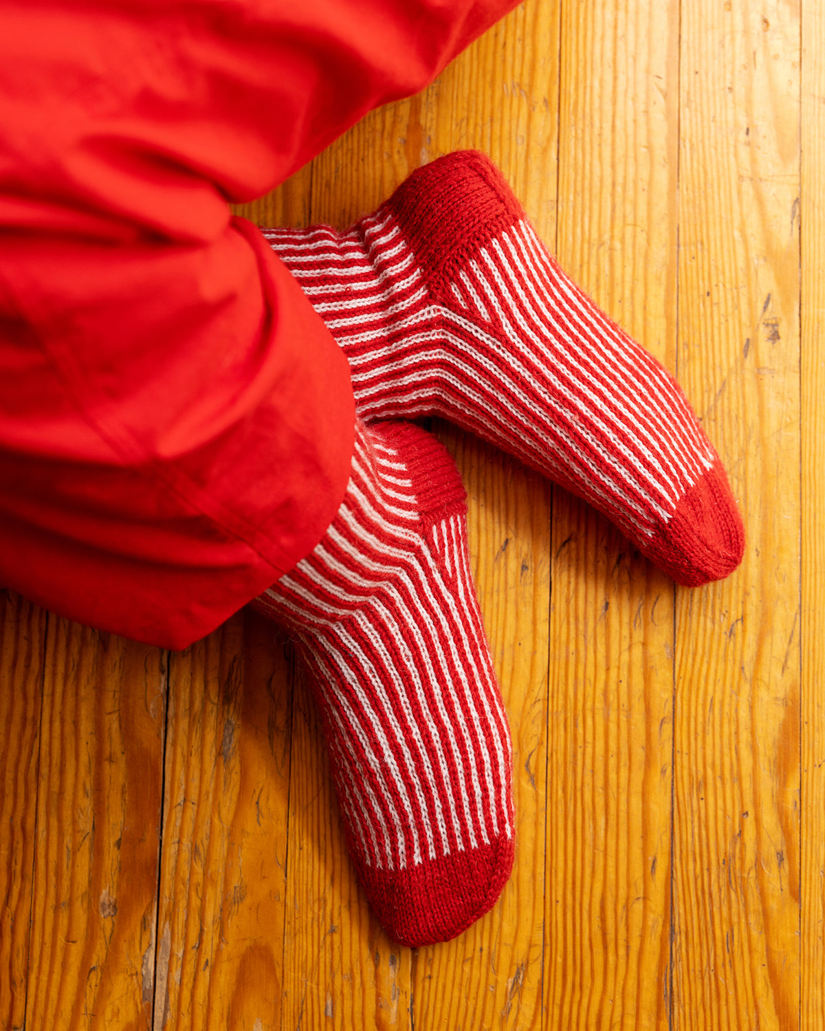 Colorwork socks featuring vertical stripes is a pleasing project also for a beginner colorwork knitter. The socks can be made more striking with bold colors.
