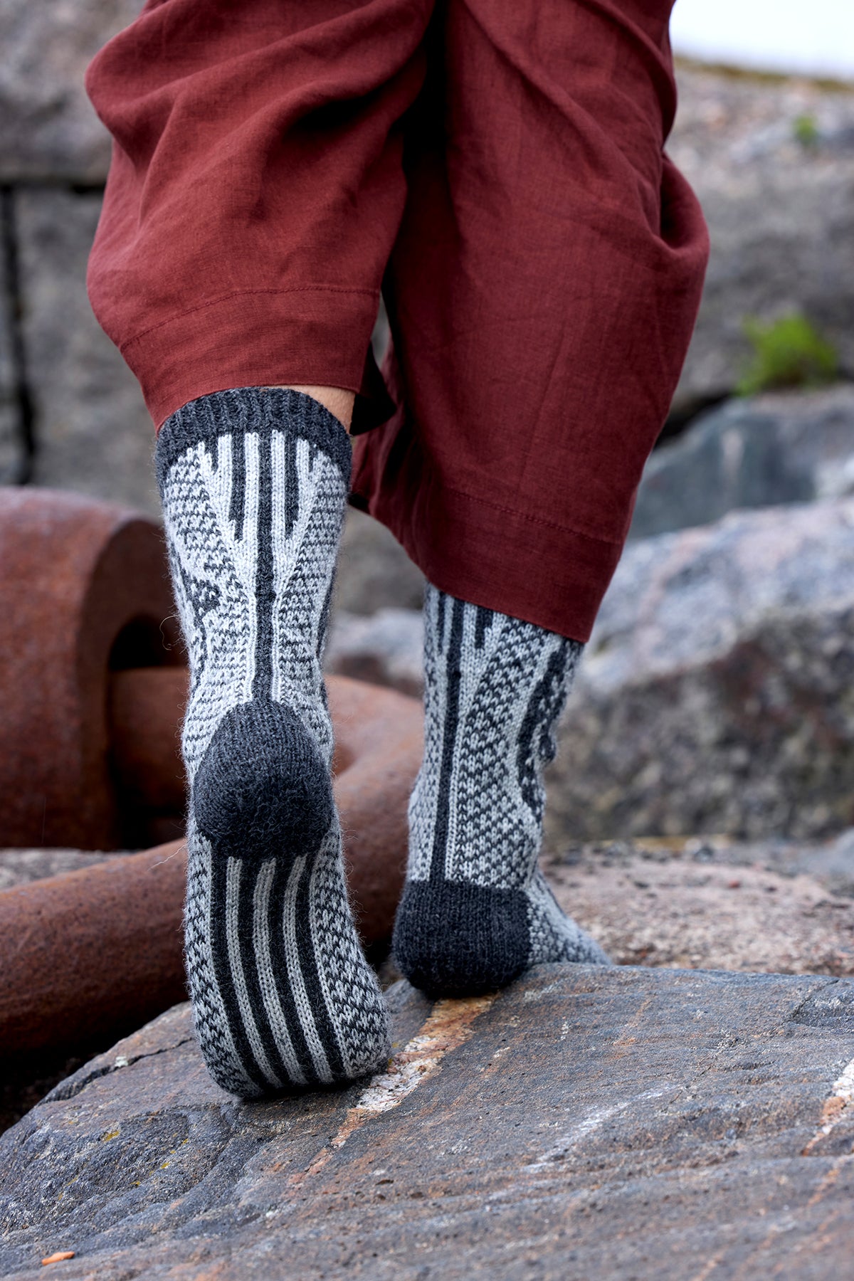 The Norppa socks pattern was first published in the Beloved Patterns & Erik Bruun knitting magazine, inspired by Finnish graphic designer Erik Bruun’s iconic posters.